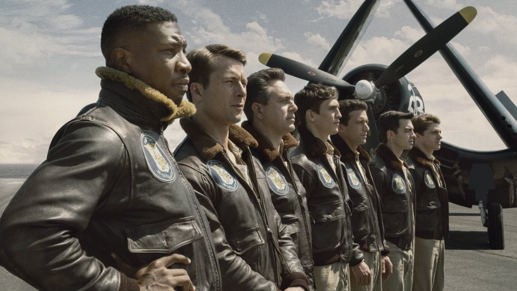 Aliás, vejo na dupla protagonista o ponto forte de “Irmãos de Honra”, enquanto Glen Powell (Top Gun: Maverick) tem charme e firmeza como um boa praça que tenta criar um vínculo com seu novo parceiro carrancudo, temos aqui Jonathan Majors (Destacamento Blood) atuando de forma sublime ao carregar o peso de ser um aviador negro que precisa provar ser bom o suficiente para estar entre melhores, além de mostrar que pode ser igual aos seus companheiros brancos nas mesmas condições e proporcionalidades nas habilidades de voo.