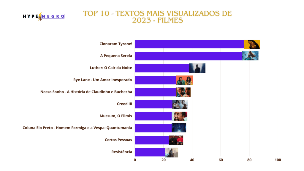 Este ano foi bacana para quem gosta de filmes protagonizados por pessoas pretas. O sucesso “Clonaram Tyrone!”, superprodução de ficção científica distópica da Netflix está no topo da lista seguido de perto de “A Pequena Sereia”, que foi um dos grandes sucessos de bilheteria de 2023 e chamou atenção pela ótima atuação de Halle Bailey no papel título. Longas nacionais como “Nosso Sonho - A História de Claudinho e Buchecha” e “Mussum, O Filmis” marcaram presença.