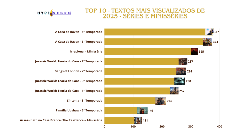 No ranking de seriados, o destaque do top 10, foram as temporadas de “A Casa da Raven” liderou com a quinta e sexta temporadas. O drama da Netflix, “Irracional” protagonizado por Colman Domingo foi uma das gratas surpresas finalizando no top 3. A série de animação “Jurassic World: Teoria do Caos” se destacou na primeira, segunda e terceira temporadas aparecendo em várias posições no top, assim como a veterana “Família Upshaw” na sua sexta temporada. A quinta e última temporada de “Sintonia” se destacou entrando nas mais lidas. A minissérie “Assassinato na Casa Branca (The Residence)” entrou no top mostrando que uma boa comédia sempre é bem valorizada. A surpresa da vez ficou por conta de “Gangs of London” segunda temporada aparecendo no top 10.
