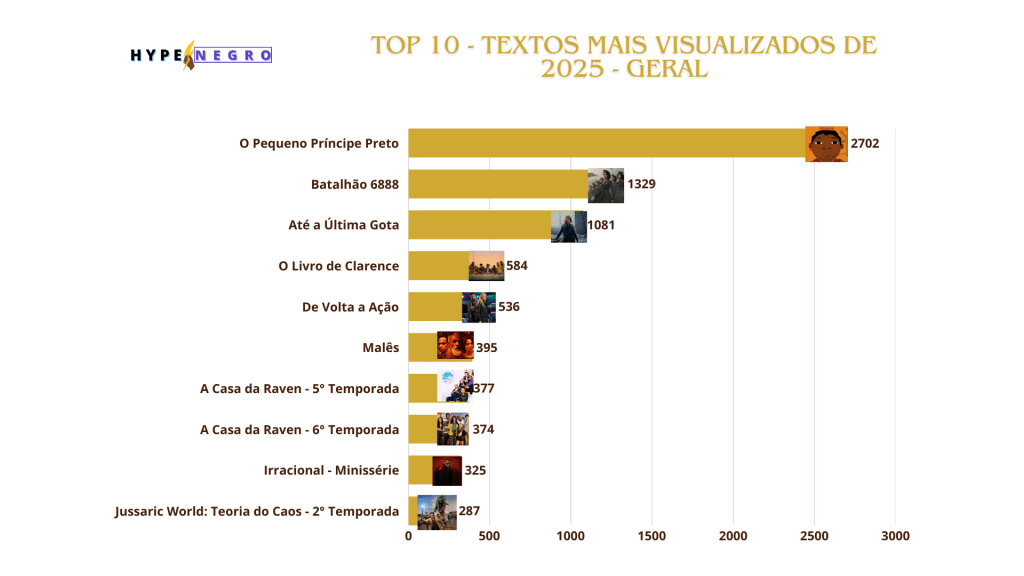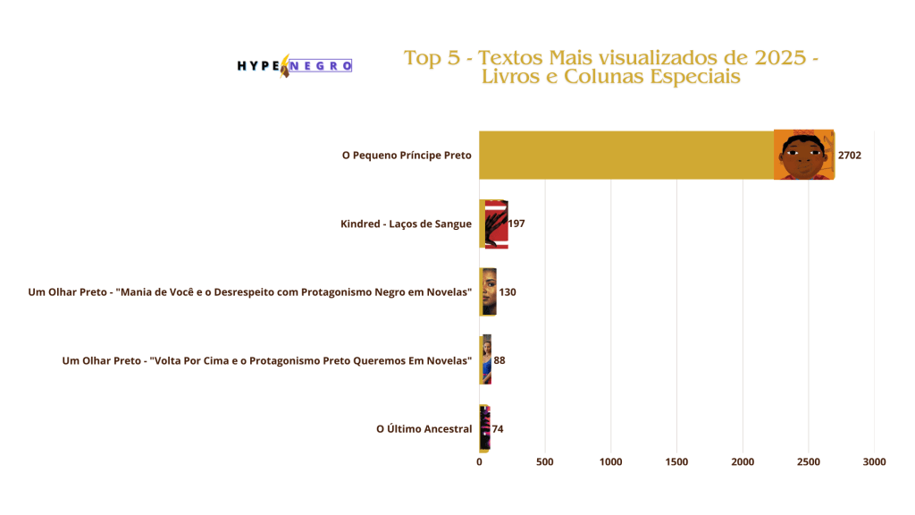 O novo ranking é focado nos livros, curtas e colunas especiais, traz alguns bons destaques do ano de 2025, a começar pelo livro brasileiro “O Pequeno Príncipe Preto” escrito por Rodrigo França que explodiu na quantidade de visualizações batendo recorde, seguido pelo livro “Kindred – Laços de Sangue” escrito pela ótima Octavia Butler. O livro nacional “O Último Ancestral” fechou o top com grande destaque de leitura escrito por Ale Santos, trazendo o afrofuturismo para literatura brasileira. A coluna especial “Um Olhar Preto” continua a fazer sucesso agora com textos sobre “Mania de Você” e “Volta Por Cima”, mostrando protagonistas negras em destaque.
