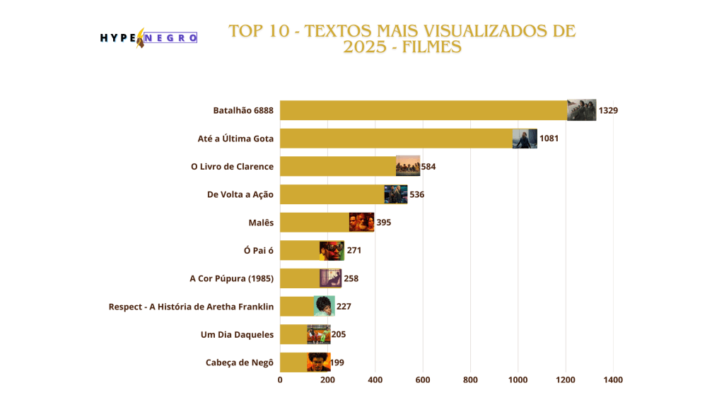 Bora começar o balanço com os filmes, este ano tivemos diversos filmes despontando no top 10, porém o longa de guerra dirigido por Tyler Perry e protagonizado por Kerry Washington, “Batalhão 6888”, atravessou 2024 e chegou liderando em 2025 e não largou o topo. Outro drama de Tyler Perry, fez sucesso este ano agora protagonizado por Taraji P. Henson, o longa “Até a Última Gota”, cravou a segunda posição. A comédia “O Livro de Clarence” continua no top 10, mas foi o longa de ação e comédia interracial protagonizado por Jamie Foxx e Cameron Diaz que surgiu fazendo sucesso, “De Volta à Ação”. O top 10 ainda teve muito filme nacional dominando, com “Malês” dirigido por Antônio Pitanga, “Ó Pai ó” protagonizado por Lázaro Ramos e o ótimo “Cabeça de Nêgo”. O longas “A Cor Púrpura (1985)”, “Respect” e a comédia sensacional protagonizada por Keke Palmer e SZA, “Um Dia Daqueles”, despontaram no topo mostrando força.